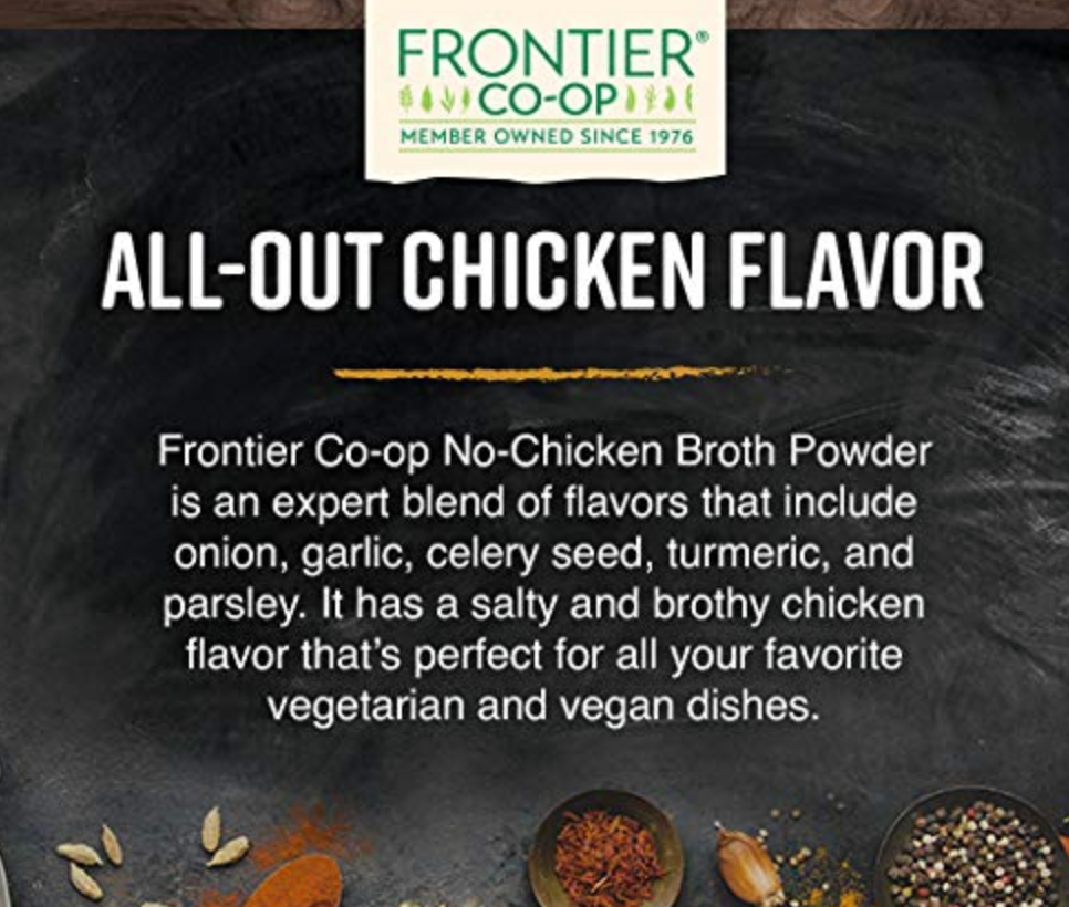 - Vegetarian Broth Powder: Frontier Co-op No-Chicken Broth Powder is a delicious vegan alternative that can be used as a substitute for chicken broth, for a chicken taste with zero animal ingredients.