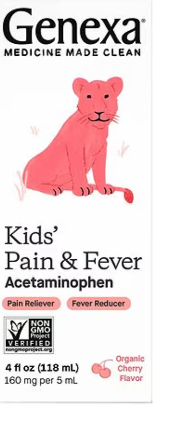 Genexa Kids' Pain & Fever Cherry is made with the same effective acetaminophen as Children's Tylenol Oral Suspension Cherry, but without any artificial fillers. Genexa Kids' Pain & Fever Cherry helps temporarily reduce fever and provides temporary relief from a range of cold and flu symptoms, including minor aches and pains, headache and sore throat. This oral suspension is made with organic cherry flavor and has the effective active ingredient your kids need for symptom relief (160 mg of acetaminophen per 5 mL), but without artificial sweeteners, artificial preservatives, artificial dyes, parabens, and common allergens. For use by children ages 2 years to 11 years.