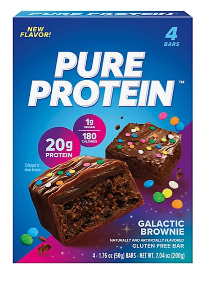Naturally flavored with other natural flavors. 1 g sugar. 180 calories. 20 g protein. Gluten free. Contains bioengineered food ingredients. New flavor! Deliciously satisfying. Packed with 20 g of protein and just 1g of sugar, our Pure Protein Galactic brownie bar is your perfect on-the-go source for lasting energy and craveable flavor. pureprotein.com. Find more delicious ways to step up your routine. Instagram. Facebook. Tiktok. (at)officialpureprotein. For questions or reorders call: 1-800-854-5019 or visit our website at www.pureprotein.com. Product of Canada.